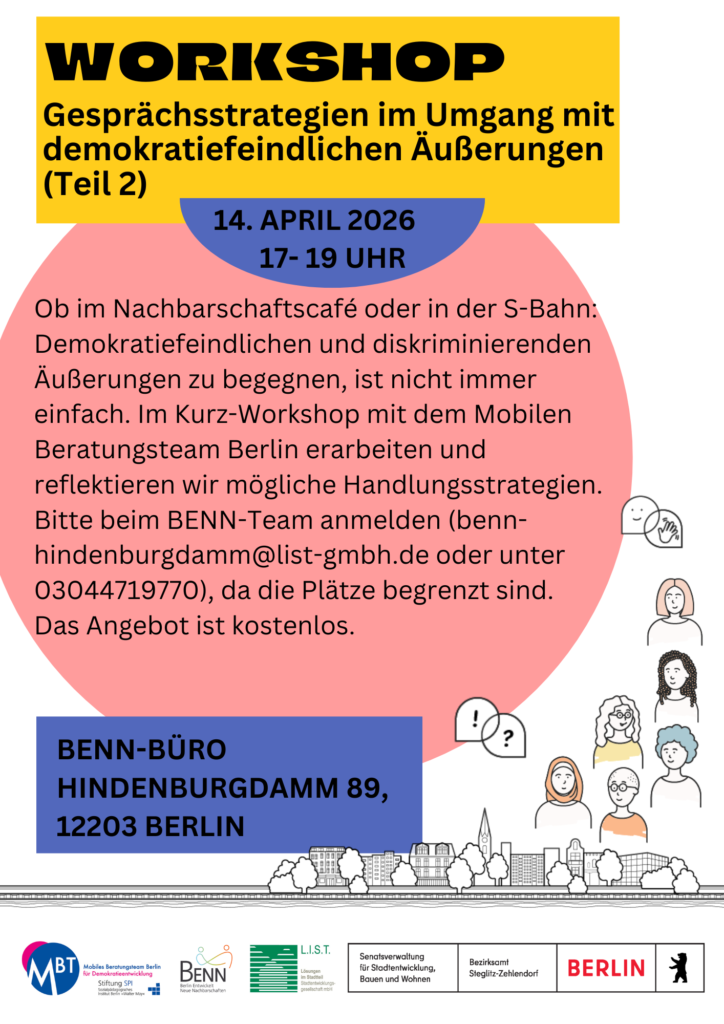Wir laden herzlich ein zum zweiten Teil des Workshops zu Gesprächsstrategien im Umgang mit demokratiefeindlichen Äußerungen am 14. April von 17-19 Uhr bei uns im BENN Büro. Mit dem MBT-Team werden wir das im ersten Teil Gelernte vertiefen und uns weiter gemeinsam mit Gesprächsstrategien im Umgang mit demokratiefeindlichen Äußerungen beschäftigen. Ein Einstieg ist auch für alle möglich, die nicht am ersten Workshop teilgenommen haben. Bitte meldet euch per E-Mail oder telefonisch (030 447 197 70) an, da die Plätze begrenzt sind. Das Angebot ist für alle kostenlos.